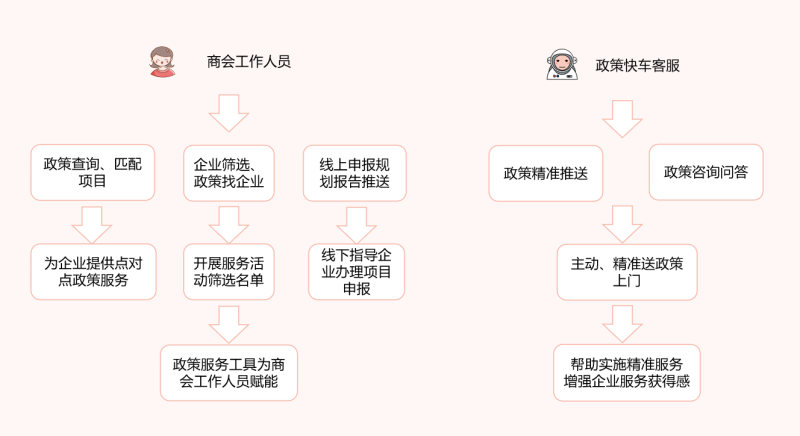 政策快車(chē)是湖南省拾牛網(wǎng)絡(luò )科技有限公司具有自主知識產(chǎn)權的一款智能化政策服務(wù)工具,基于互聯(lián)網(wǎng)+人工智能+大數據”技術(shù),為企業(yè)智能匹配、精準推送符合條件的政策項目,為政府、園區、平臺、商協(xié)會(huì )等企業(yè)服務(wù)組織篩選已獲政策支持企業(yè)和政策培育企業(yè)。政策快車(chē)還具有申報大數據分析、企業(yè)申報對標分析、申報規劃報告下載、項目精準測評、政策支持效果評估、政策支持統計分析等強大功能,不僅提高了商會(huì )工作人員的工作效率,還能幫助企業(yè)服務(wù)組織實(shí)施精準服務(wù),增強企業(yè)服務(wù)獲得感。