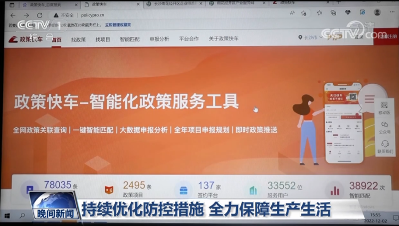 124日,中央廣播電視總臺央視綜合頻道《晚間新聞》報道長(cháng)沙市雨花區持續優(yōu)化防控措施、全力保障生產(chǎn)生活,出現雨花經(jīng)開(kāi)區工作人員應用政策快車(chē)為企業(yè)提供服務(wù)的畫(huà)面。125日,《朝聞天下》《新聞30分》《新聞直播間》《共同關(guān)注》等欄目報道中,政策快車(chē)再次亮相。